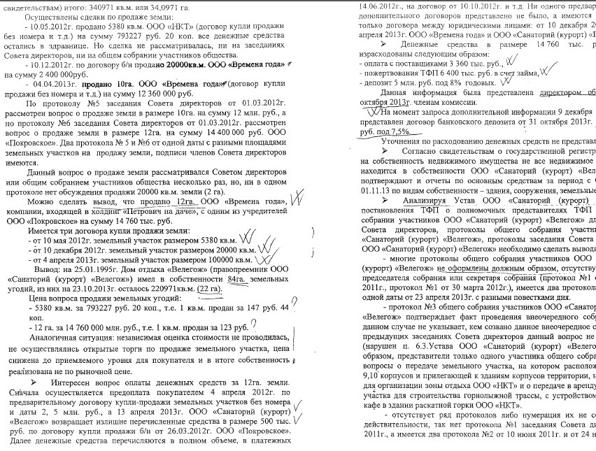 Вот первый раз увидел этот "документ" . Так на любого можно состряпать, было бы желание. Но есть один вопрос. Почитав внимательно, видно , что во всех этих " сделках" фигурируют 1. Совет директоров, Директора санаториев. Они же все принимали решения, голосовали. Или их что опоили или они недееспособные. Подписи свои ставили на документах. При чем здесь тогда один человек? Видать сами что-то замутить хотят , вот и убрали человека. Не верю сейчас никому. Кинут и глазом не моргнут. За бабло вообще удавят