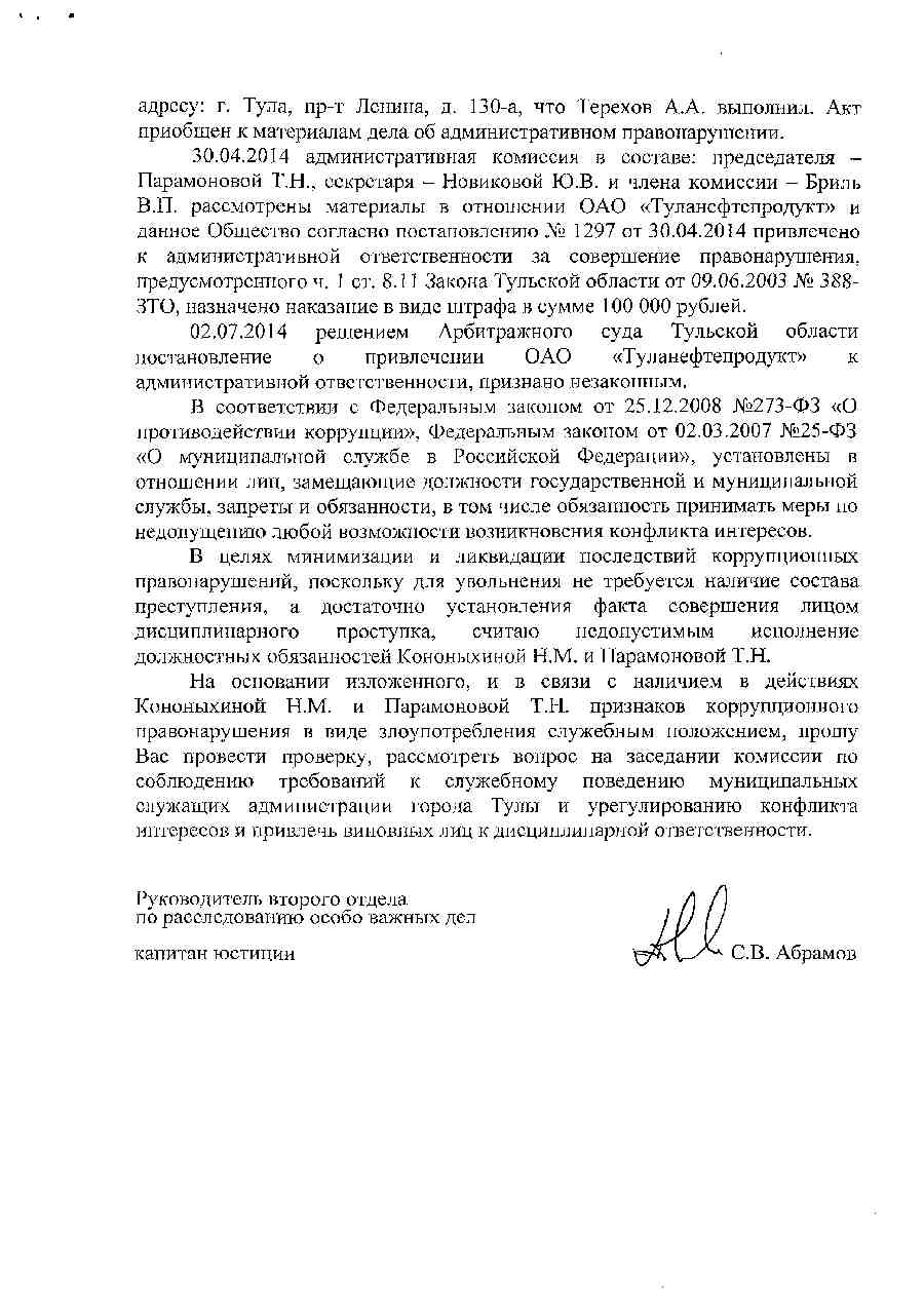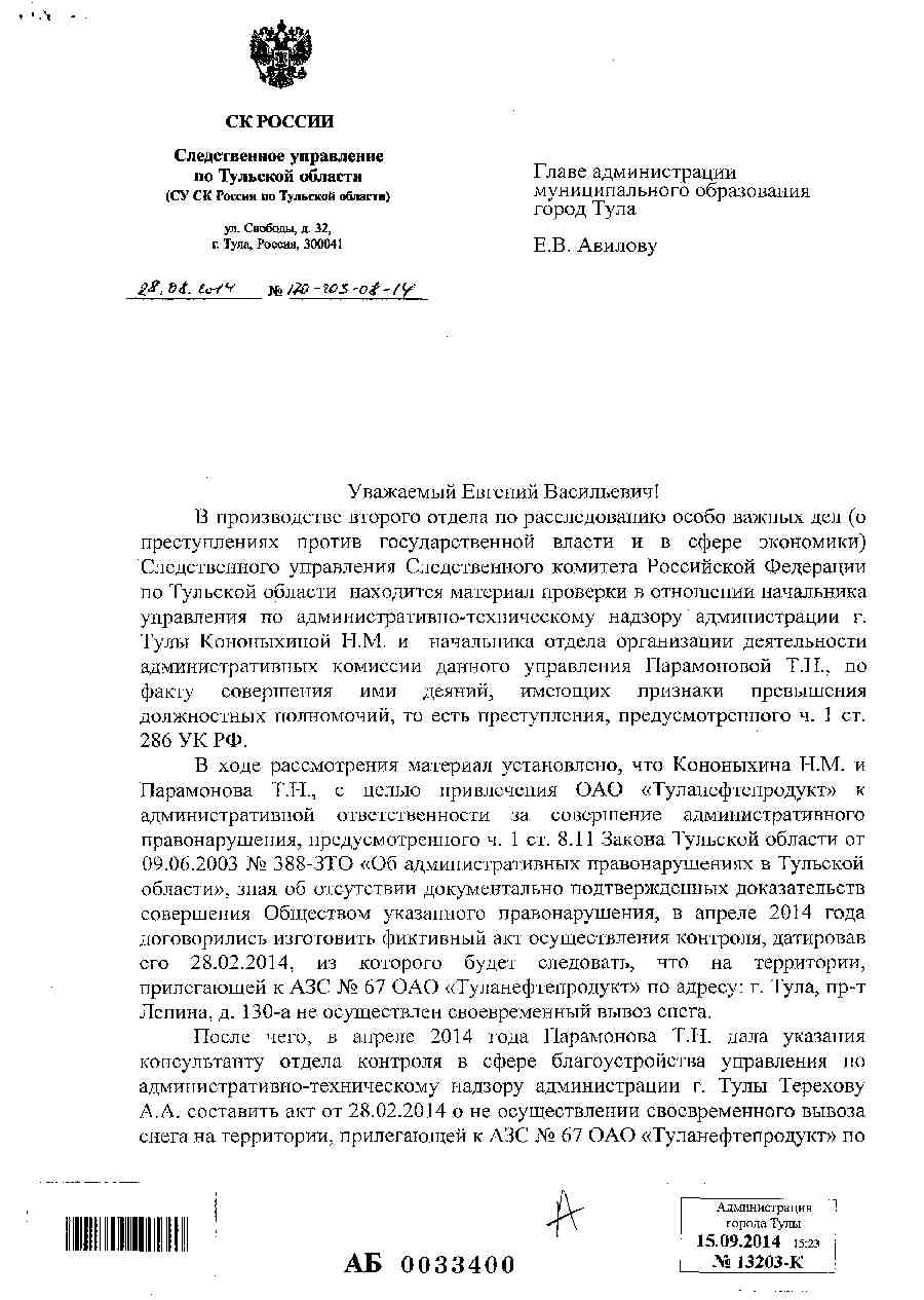 В производстве Следственного управления Следственного комитета Российской Федерации по Тульской области находится материал проверки в отношении начальника управления по административно-техническому надзору администрации г. Тулы Кононыхиной Н.М. , по факту совершения ими деяний, имеющих признаки превышения должностных полномочий, то есть преступления, предусмотренного ч. 1 ст. 286 УК РФ.