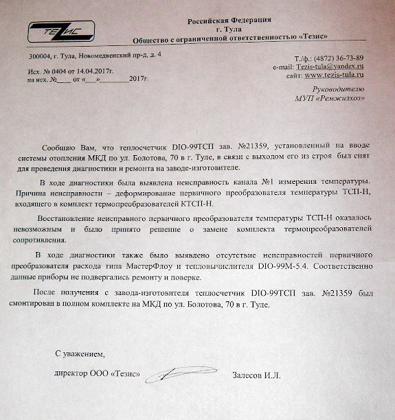 Спокойно, в домашней обстановке, прочитала это письмо и вот, что я думаю по этому поводу сейчас: оборудование отсутствовало в доме с 22 декабря 2016 г. по 22 марта 2017 г., то есть три месяца, со слов работников ООО «Тезис» и чиновницы УК, оно было в ремонте. А теперь мы получаем письмо от подрядчика, одного из виновных в том, что собственники заплатили по общедомовому счетчику всего лишь за два месяца, вместо 12-ти, а за остальные месяцы пришлось платить за тепло по среднему значению. А разве письмо не должно было быть от завода-изготовителя, куда эти приборы возили на диагностику? И еще, кто-то погнул термометр, вместо того, чтобы его сразу заменить, снимают дорогостоящие электронные приборы учета (демонтаж, монтаж – то же денег стоит), везут в Москву и обратно, платят за диагностику, а потом приобретают термометр за 1500 руб. – бред какой-то!