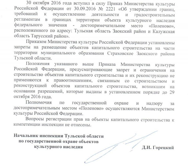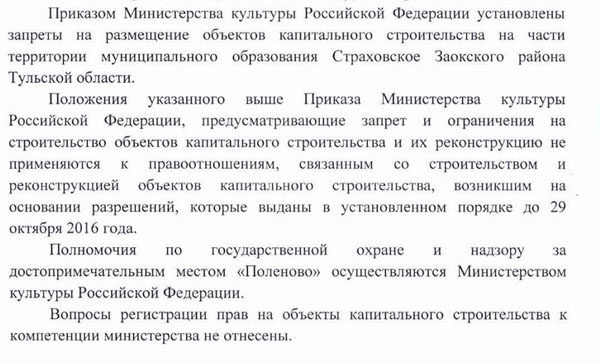 В нашей [ИА «Тульская пресса»] предыдущей публикации мы рассказали историю одной из владелиц участков Натальи Левченко. Обратившись за разъяснением в Инспекцию по госохране объектов культурного наследия Тульской области, мы [ИА «Тульская пресса»] получили ответ такого содержания: