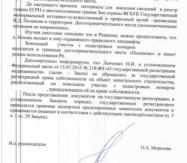 Но тогда почему же другие жители, находящиеся в такой же ситуации, массово получают отказы? В чем мотивация и где искать выход из сложившихся проблем? Эти вопросы мы решили задать уже федеральному Министерству культуры — может, хотя бы ее компетенции и авторитета будет достаточно для наведения порядка в «поленовских» землях.