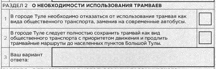 Вчера в некоторых тульских СМИ опубликовали Лист для голосования по стратегии развития общественного транспорта, где тулякам в т.ч. предлагают высказать мнение о необходимости использования трамваев: