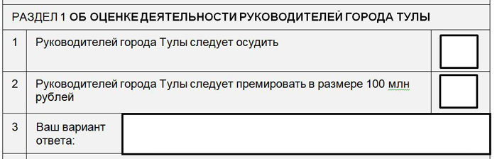 Наверняка даже те туляки, которые не имеют претензий к руководителям Тулы, не согласились бы премировать руководителей из городского бюджета на огромную сумму в 100 млн рублей. При этом писать свой вариант ответа многие бы также отказались. Поэтому скорее всего большинство туляков, пусть и по разным причинам, но всё же выбрало бы вариант «осудить«.