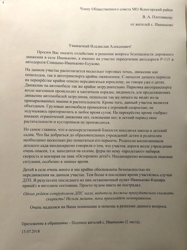 Сегодня я получил обращение от жителей села Иванькова с подписями 92 жителей, опасающихся за свою жизнь и жизни своих детей, с просьбой оказать содействие в обеспечении безопасности дорожного движения. Теперь я решительно продолжу требовать от Тулаавтодора обеспечить безопасность на дороге в Иваньково: