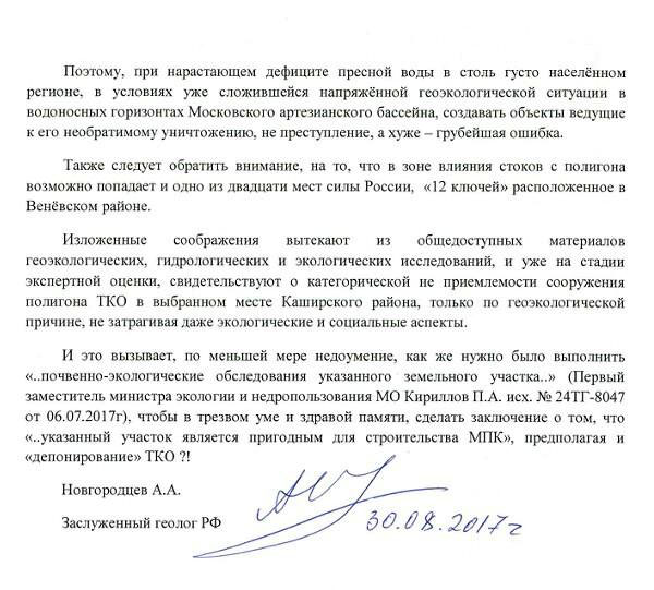 С ней согласен и заслуженный геолог России Анатолий Новгородцев, который в ответ на запрос депутата дал пояснение, что в этом месте находятся залежи артезианской воды, которую он ранее обнаружил, проводя геологические изыскания. Строительство полигона, пишет учёный, приведёт к безвозвратному уничтожению местной природной среды. Кстати, под угрозой окажется и венёвская достопримечательность «12 ключей» — освящённый и благоустроенный источник, одно из красивейших природных мест, куда съезжаются туристы и паломники.