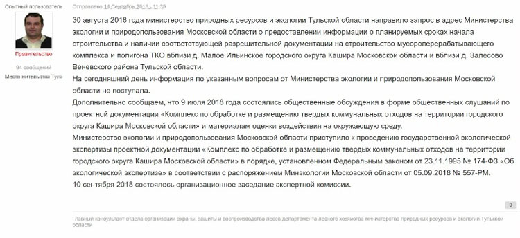 «30 августа 2018 года министерство природных ресурсов и экологии Тульской области направило запрос в адрес министерства экологии и природопользования Московской области о предоставлении информации о планируемых сроках начала строительства и наличии соответствующей разрешительной документации на строительство мусороперерабатывающего комплекса и полигона ТКО вблизи д. Малое Ильинское городского округа Кашира Московской области и вблизи д. Залесово Веневского района Тульской области. На сегодняшний день информация по указанным вопросам от министерства экологии и природопользования Московской области не поступала», — говорит чиновник.