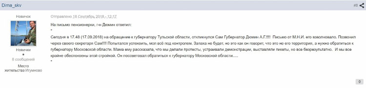 Как пишет один из жителей на форуме регионального правительства, до Дюмина достучаться всё-таки удалось, однако он переадресовал вопрос своего коллеге из Подмосковья Андрею Воробьёву, который, как мы знаем, не прочь перенаправлять столичные отходы в регионы.