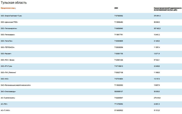 Тульская область задолжала за газ 1,2 млрд рублей. Здесь насчитывается 16 организаций-должников. Сильнее всего просрочили долги ООО «ЭнергоГазИнвест-Тула» (376 млн рублей), ООО «Теплоэнергетик» (307 млн) и АО «Тулатеплосеть» (279 млн).