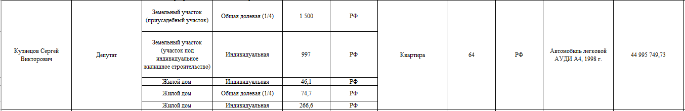 В сведениях Сергея Кузнецова доход за год определен в сумме 44 995 74 рублей. У него есть земельный участок, доля еще в одном, два дома в собственности и доля — в третьем. Он владеет «Ауди А4″.