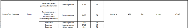 Олег Суханов в сведениях указал годовой доход в сумме 47 048 рублей. У него в собственности указан участок земли в 10 соток, жилой дом площадью 295 квадратных метров, квартира и доля еще в одной. Собственного автотранспорта у депутата, судя по декларации, нет.