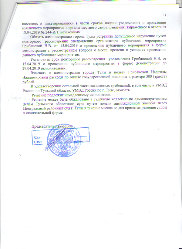 В суде Центрального района города Тулы прошло заседание по иску КПРФ, которая оспаривала отказ городской администрации в проведении первомайской демонстрации и митинга. Сначала чиновники не разрешили мероприятие под предлогом того, что уведомление было подано за 16 дней до мероприятия, придумав, что делать это надо в промежуток от 15 до 10 дней. Однако суд согласился с доводами КПРФ о том, что чиновники нарушили закон: согласно постановлению пленума Верховного суда, день подачи уведомления и день проведения самого публичного мероприятия при этом не учитываются.