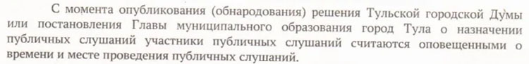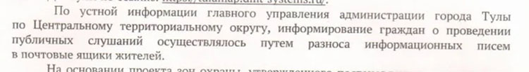 Со слов администрации мы были оповещены, т.к., цитата, «По устной информации главного управления администрации города Тулы по Центральному территориальному округу, информирование граждан о проведении публичных слушаний осуществлялось путем разноса информационных писем в почтовые ящики жителей». Обращения к Губернатору и в Прокуратуру с вопросом корректна ли ссылка на «устную информацию» успехов не имела и привела к возврату жалобы Администрации. Последняя жалоба в Прокуратуру была дана 24 февраля и пока осталась без ответа.