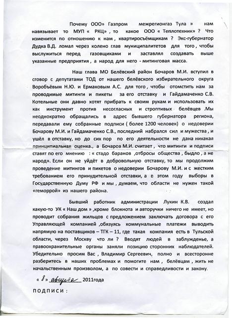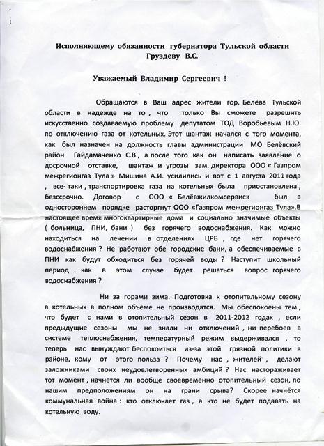 Дожили! Белевцы пишут письма и телеграммы новому губернатору (копии прилагаются), как это было при В.Дудки. Дудка не внял просьбам жителей, Белев взбунтовался.