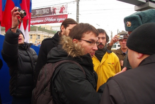 КПРФ проигнорировала митинг, как я щас узнал, коммунисты подписали все итоговые протоколы по области, в итоге был лишь один красный флаг, да и тот довольно странный (но об этом потом). Зато Яблочники во главе с Тимаковым вышли на площадь – молодцы. Были ребята из ОГФ, народные демократы Касьянова, народ из ПарНаСа тоже присутствовал. Но большинство было беспартийных. Обычные такие люди недовольные итогами выборов. Были и провокаторы. Пара ребят призывала, то двинутся маршем к трем штыкам, то прорвать отцепление ОМОНа и двигать к центу площади Ленина, где проходила «выставка спецтехники». Были и фаши-провокаторы. Пара ребят с имперским флагом прискакали в передние ряды и на камеру начали кричать «Россия для русских» и прочие словеса, хорошо хоть зиги не кидали. Народ на митинге этого не оценил, началась перебранка. Сначала один парень пытался добиться от ментов, чтобы провокаторов вывели, потом и я с ними начал «собачится» из-за взглядов на жисть… Суть да дело… паренёк с красным флагом снял полотнище, и втроем уже они водрузили имперский триколор на палку. В скорости этих двух фашиков забрали люди в штатском. Прошел час… покричали лозунги – За честные выборы и Путин – краб. После этого меня знакомая предупредила, что готовят моё задержание. Мы с Ванькой дабы не мозолить глаза ментам углубились в толпу. Встретили Лильку, начали болтать…