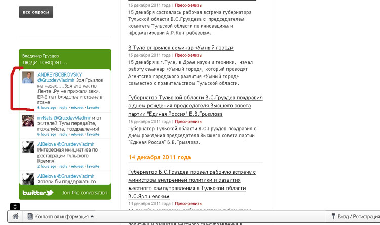 Туда засасывается всё с тегом @GruzdevVladimir. Можно даже слово "йух" 20 раз написать, тоже на губернаторский сайт попадет