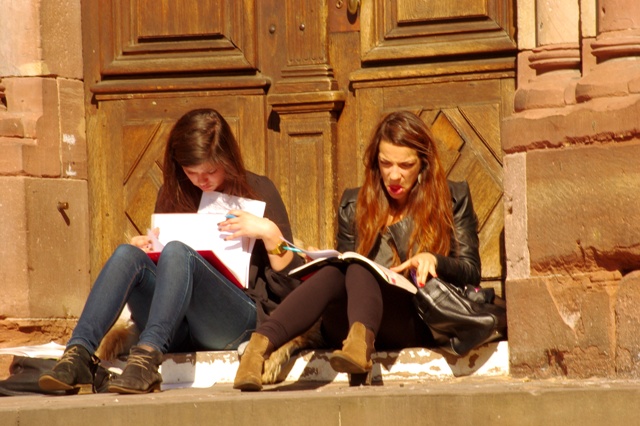 Придумайте подпись к снимку двух студенток на ступеньках кафедрального  собора в Страсбурге