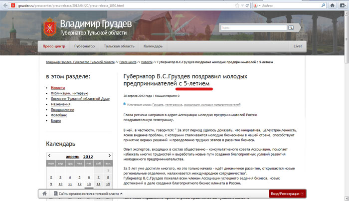 а чего вы удивляетесь? откройте на этом сайте раздел — полномочия губернатора: их там нету — уже скоро год Груздеву))) — а сам он без полномочий. и пресс-служба у него такая же — без полномочий править тексты)))