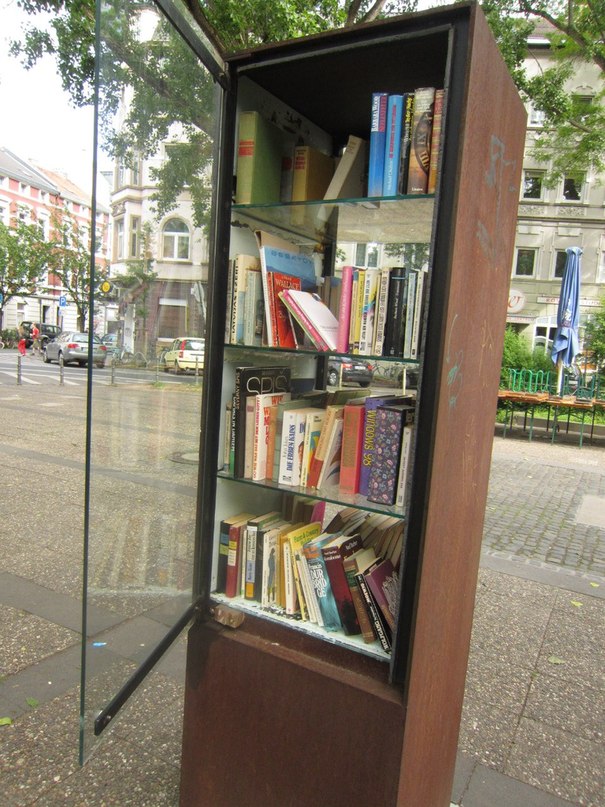 А это уличная библиотека в Бонне. Стоит обычный стеклянный шкаф или телефонная будка с полками. Каждый желающий может взять нужную ему книгу с полки без всякой записи и затем вернуть ее на прежнее место. Вот так в Европе поддерживается любовь к чтению и книге.