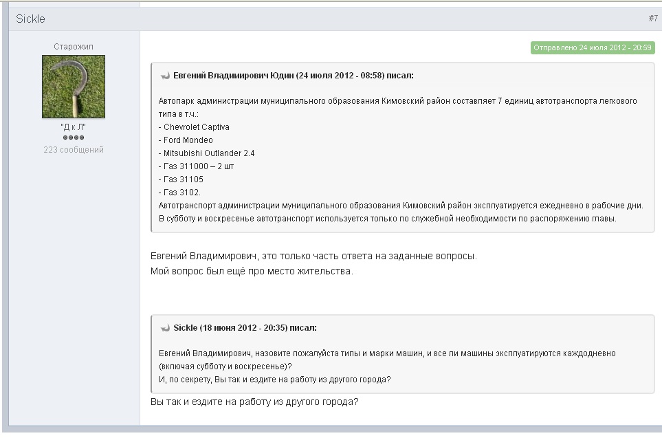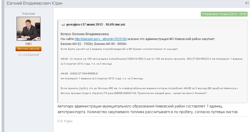 вас научили говорить не правду ваши помошники Морозова , Писорева и другие. Вы не жили в Кимовске об этом говорила Морозова и на работу появлялись невовремя, а насчет машин, как ездели все в воходные дни все так и ездиют. Машина и у вас. у Грибкова, у Ермалаева, хотя он разбил машину с любовницей не свою , а муниципальную, у Морозовой, у Писоревой, у Бирюкова,у Жариковой. Почему на муниципальных машинах ездят народные избранники Прощолыкин и Гоманова это еще две машины, на питание в детские сады денег нет в муниципалитете, заставели собирать с родителей пожертвование, а на машины и бензин есть. Чудеса и только! Вы скажите , вы не знаите, что у вас на муниципальных должностях работают судимые люди и без высшего образования. Нам жалко вас за три года вы не стали нормальным главой , а это потому что вы оставели команду от Илясова, которая продалжала работать не для кимовчан, не на вас, а на себя, как это делала Морозова.