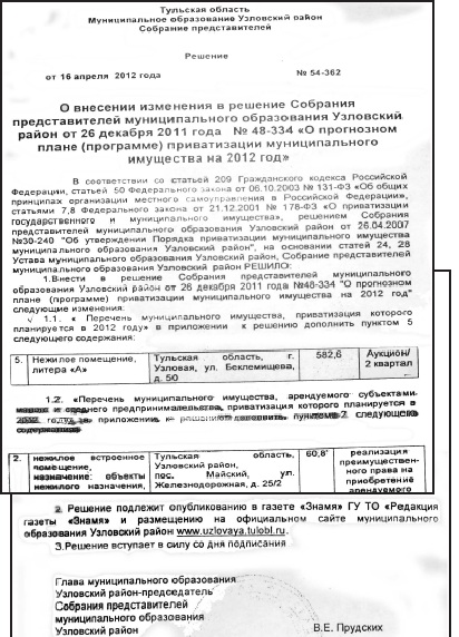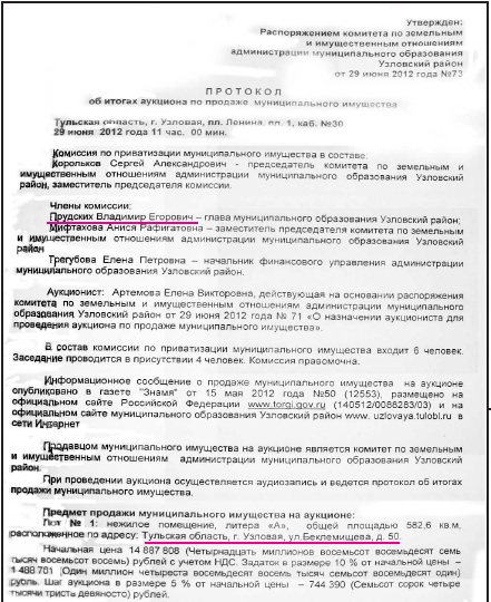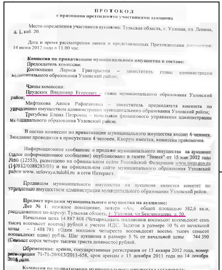 Странно, что ни в Протоколе о признании претендентов участниками аукциона, ни в Протоколе об итогах аукциона по продаже муниципального имущества мы не находим фамилии Березина А.А. Однако оба документа подписаны Прудских В.Е., который как видите, является не только главой муниципального образования Узловский район, но и членом Комиссии по приватизации муниципального имущества. Ну, может, хотя бы инициатором аукциона был Березин? Опять нет.
