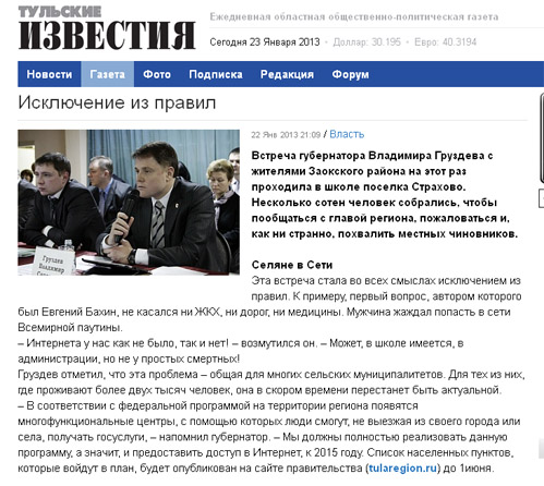 Евгений Бахин из Заокского раойна на встрече с первым лицом области посетовал на то, что в посёлке Страхово нет интернета. Владимир Груздев с присущим ему чувством юмора ответил, что до 1 июня страховцы смогут в подробностях узнать о том, будет ли решена эта проблема… на сайте правительства области.