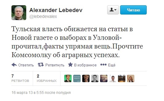 “Тульская власть обижается на статьи в Новой газете о выборах в Узловой-прочитал,факты упрямая вещь.Прочтите Комсомолку об аграрных успехах”.