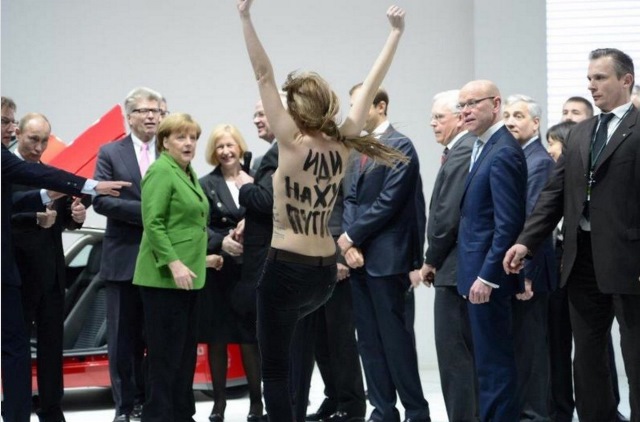 Начало визита было омрачено активистками движения Femen, которые на ярмарке  разделись по пояс перед российским президентом и канцлером Германии Ангелой Меркель.