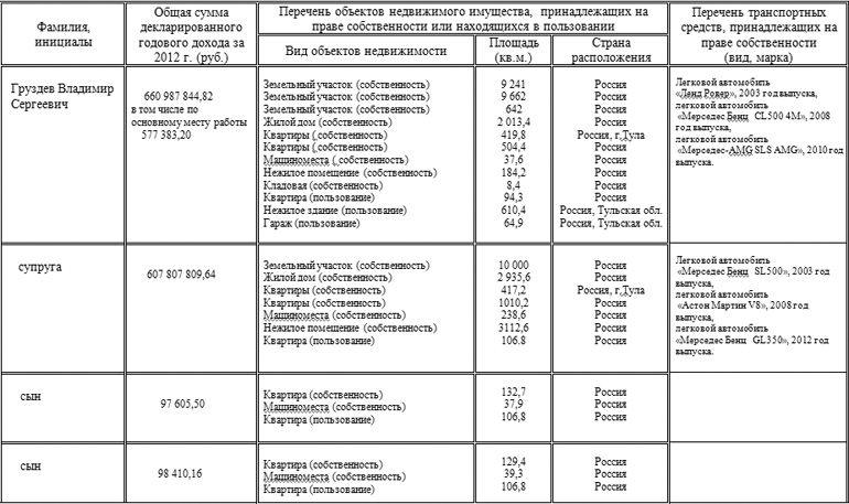 Личный доход губернатора Тульской области, одного из основателей сети «Седьмой континент» Владимира Груздева в 2012 г. уменьшился больше чем в пять раз по сравнению с 2011 г. — он заработал 661 млн руб. по сравнению с 3,7 млрд руб. Зато доход его жены значительно увеличился — до 608 млн руб. по сравнению с 182,7 млн руб. в 2011 г. Но по семейному доходу — 1,269 млрд руб. — Груздев пока первый среди российских чиновников.