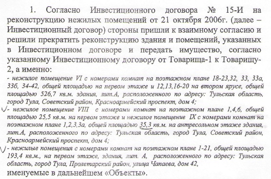 Однако уже на следующий день, 1 ноября 2006 года, появляется акт приема-передачи, в котором сказано: «Согласно инвестиционного договора №15-И на реконструкцию нежилых помещений от 21 октября 2006 года стороны пришли к взаимному согласию и решили прекратить реконструкцию здания и помещений, указанных в Инвестиционном договоре, и передать имущество, согласно указанному Инвестиционному договору, от Товарища-1 к Товарищу-2».