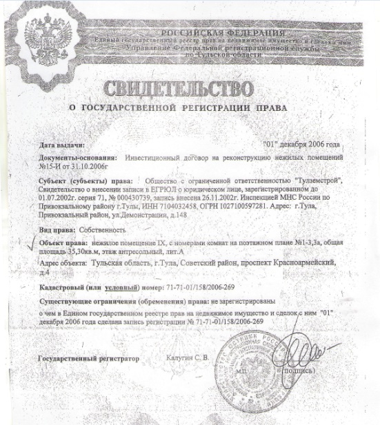 А ровно через месяц, 1 декабря 2006 года – столько времени в 2006 году требовалось на регистрацию недвижимого имущества в ТОРЦ – появляется свидетельство о государственной регистрации права собственности за ООО «Тулземстрой», подписанное Государственным регистратором Калугиным С.В.