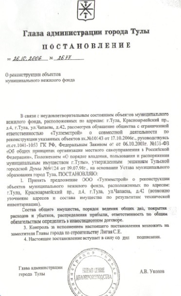 26 октября 2006 года глава администрации г. Тулы А.В. Уколов подписывает постановление №2677 о реконструкции объектов муниципального нежилого фонда.