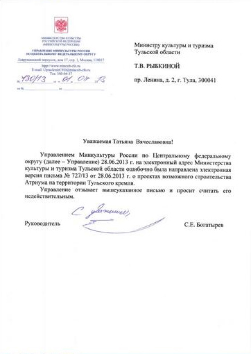 И что получилось? В письме написано "…28.06.2013 на электронный адрес министерства культуры и туризма Тульской области ошибочно была направлена электронная версия письма № 727/13 от 28.06.2013…."