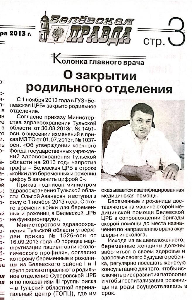 Пишите, пишите, хоть в профсоюз жителей Белева! Никаких нарушений НЕТ! Больницу не закрыли, а закрыли только отделение родовспоможения из-за отсутствия рожениц и квалифицированного персонала. Но вы пишите, пишите …