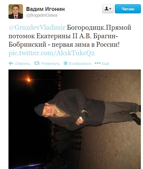 Глава администрации Богородицкого района Владимир Игонин в своем твиттере отчитался губернатору о первой зиме  в России прямого потомка Екатерины II Алексея Брагина -Бобринского. При этом фотография “потомка”, выглядевшего совсем не по-графски,  оказалась перевернута.