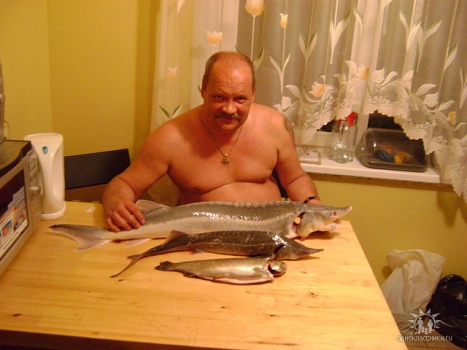 Это фотомонтаж ; там одна рыба стоит столько сколько его свч , электрочайник, стол и хлебница вместе взятые . Игорь скромный и голый ( смотри на фото).