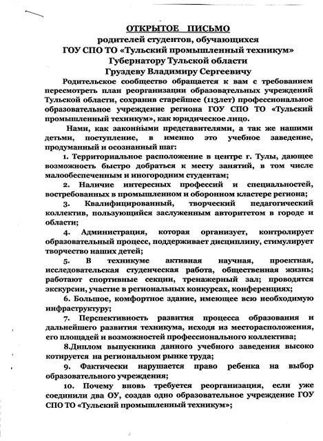 И всего-то 22 подписи, и то с трудом набрали. Готовила письмо сама "ДИЛЕКТОР",это точно! Родителям все равно ,где местоположение техникума,а вот преподавателям…….