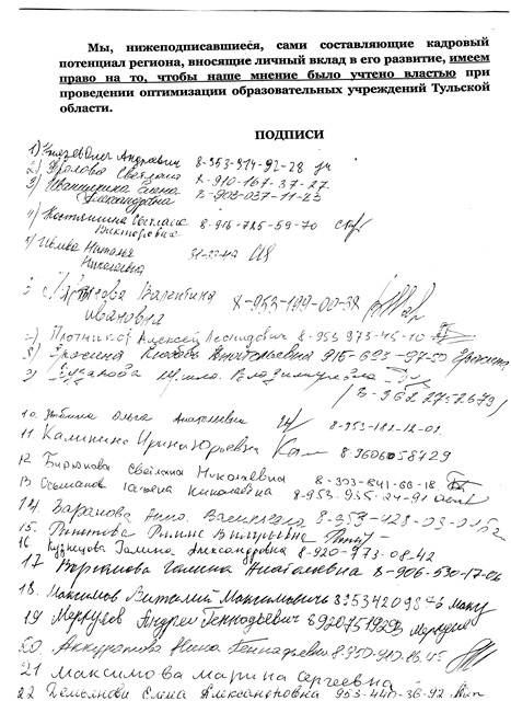 Вот публикуете фио и телефоны, не опасаетесь распространять эту личную информацию? И что то мало насобирали подписей, где эти сотни возмущенных? Забиняк, вчера присевший на 5 лет, тоже собирал и кричал, что кругом враги народного образования обложили и он до самого верха дойдет за правое дело в борьбе)))