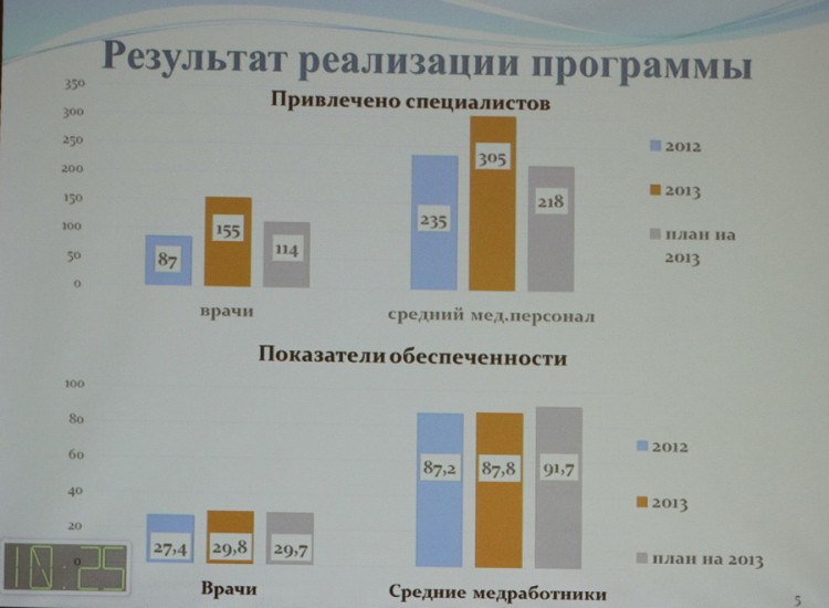 В ее докладе речь шла и об успехах тульской медицины. В частности, согласно ее докладу, целевой показатель обеспеченности врачами на 10 тысяч населения в 2013 году выполнен.
