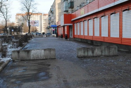 Но железобетонные заградительные блоки возле объекта «магазин» надежно охраняют подступы к входной двери этой торговой точки.