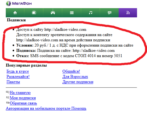 Смотрю со интернетовского счета Мегафона слишком быстро стали пропадать деньги. Стал разбираться, и с удивлением понял, что меня подписали на какую то полупорнографическую хрень.