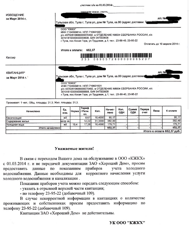 две квитанции одна правильная,другая зеленого цвета за услуги жкх жителям мкд посылали структуры Авилова,один из которых Геннадий Мельников,ныне директор тулгорэлетротранса.