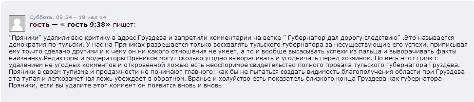 В этом коментарии, пожалуй, не соглашусь лишь с одним тезисом, что «на Пряниках разрешается только восхвалять тульского губернатора за несуществующие его успехи, приписывая ему то,что сделано другими и к чему он ни какого отношения не умеет, а то и вообще высасывать успехи из пальца и выворачивать факты наизнанку».