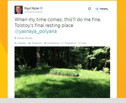 После того как посол Австралии Пол Майлер побывал в Ясной Поляне на могиле Льва Толстого, он оставил в своем твиттере следующую запись: