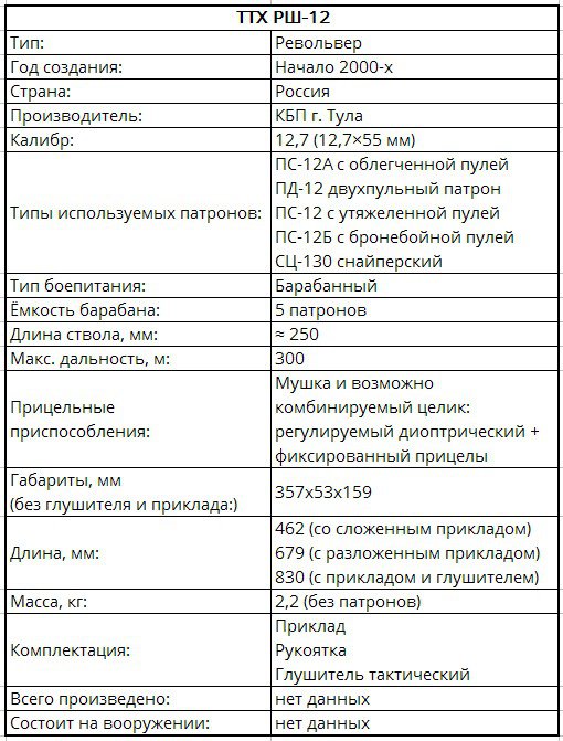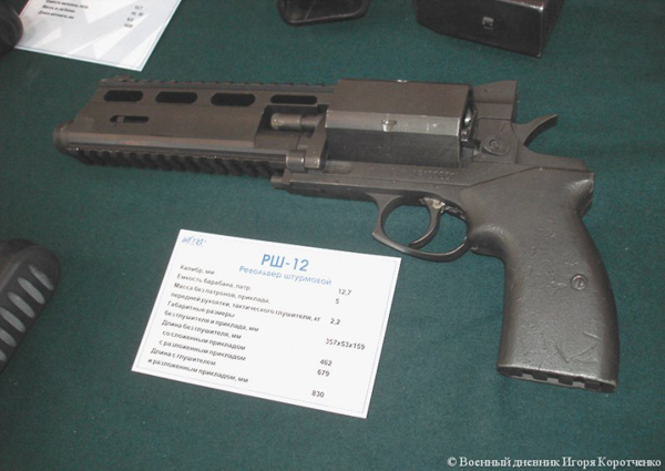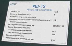 * РШ-12 с цельной металлической рамкой и барабаном на пять патронов калибра 12,7х55 мм разработан для подразделений спецназа. Весит оружие около 3 кг, длина — не больше 830 мм вместе с глушителем и прикладом.
