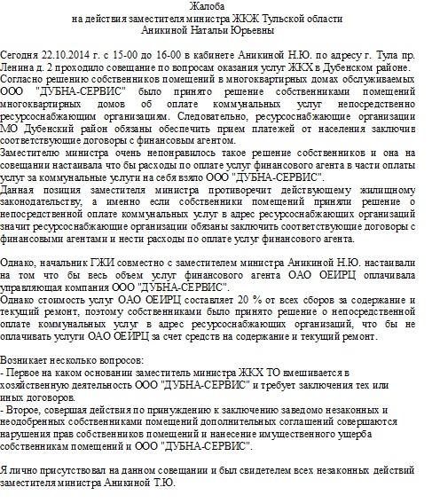Тульское областное отделение общественной организации «Безопасное Отечество» разместило в своём твиттере жалобу на действия заместителя областного министра ЖКХ Натальи Аникиной (на фото).