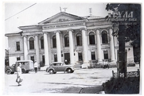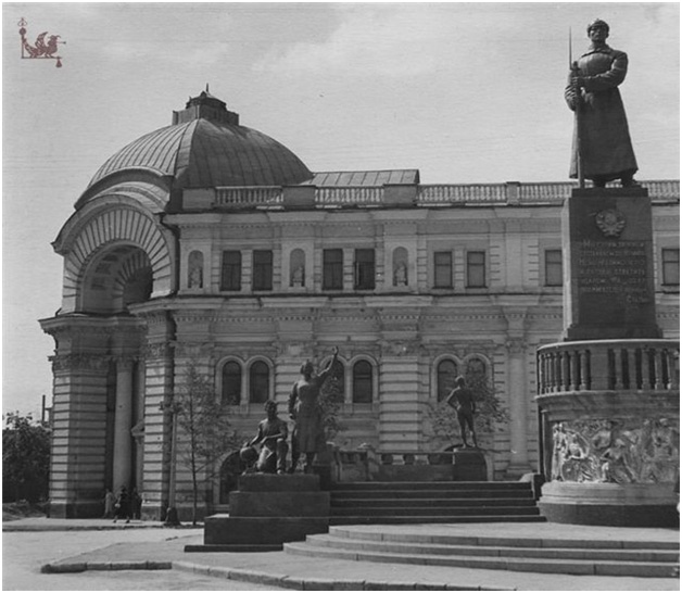 На этой площади мы не гуляли , а вот родители рассказывали, что частенько бегали сюда на танцы, до войны, и что здесь побывали герои-челюскинцы, отсюда и название. На заднем плане – Дворец пионеров (здание бывшей городской Думы), куда я ходила почти каждый день. Уж очень активная была, занималась в двух кружках: в танцевальном и драматическом, а еще была членом городского клуба «Факел» для активистов пионерской организации. Здесь же меня, чуть раньше, в торжественной обстановке, приняли в пионеры.
