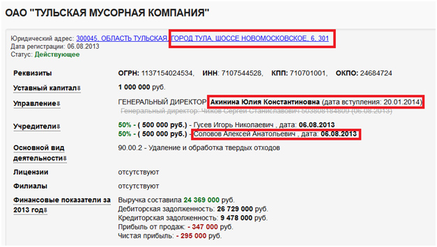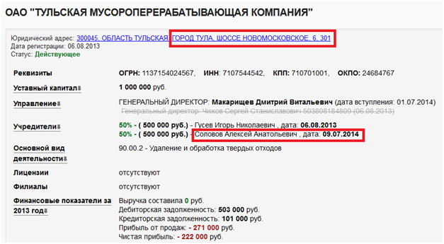 Про свеженькие, зарегистрированные в 2013 году, ОАО «Тульская мусорная компания» и ОАО «Тульская мусороперерабатывающая компания» широкая публика наверняка слышит впервые. Чем же они занимаются? Ба, да это же просто шик! Основной вид деятельности – удаление и обработка твердых отходов. И кто же равноправный участник этого высокодоходного, но дурно-пахнущего бизнеса? Да, неужели, опять Алексей Анатольевич Соловов?