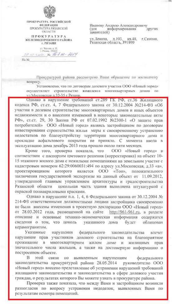 На следующий запрос реакция жилищной инспекции была уже не такой «лояльной»… Прочие инстанции либо отчитывались о передаче писем в другие властные или контролирующие структуры, либо заявляли о том, что не в их компетенции изменить ситуацию и предлагали обратиться в суд. Администрация президента рассмотрела запрос и переправила его в правительство Рязанской области. Администрация города Рязани 5 сентября 2014 года сообщила жалобщикам, что в адрес директора ООО «Новый город» О.А. Аверьянова направлено письмо с рекомендацией по устранению замечаний, перечисленных в их обращении, и заключительной фразой снова напомнила, что заинтересованные лица вправе обратиться в суд.