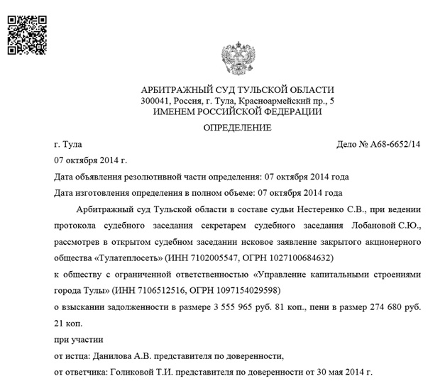 Мы решили разобраться и разобрались. Обращались в Государственную жилищную инспекцию, в прокуратуру, несколько раз прокуратуры несколько раз встречались с заместителем Авилова по ЖКХ Вячеславом Галкиным. Побывали в управляющей компании — ООО «Управление капитальными строениями города Тулы», в ЗАО «Теплосеть» (По имеющимся сведениям, долг УК «Теплосетью» 6,5 миллиона рублей. «Тульские PRяники» прилагают ниже материалы Арбитражного суда, подтверждающие факт задолженности). Но всё без толку, хотя у нас и сложилось впечатление, что все инстанции в курсе этих мутных дел.
