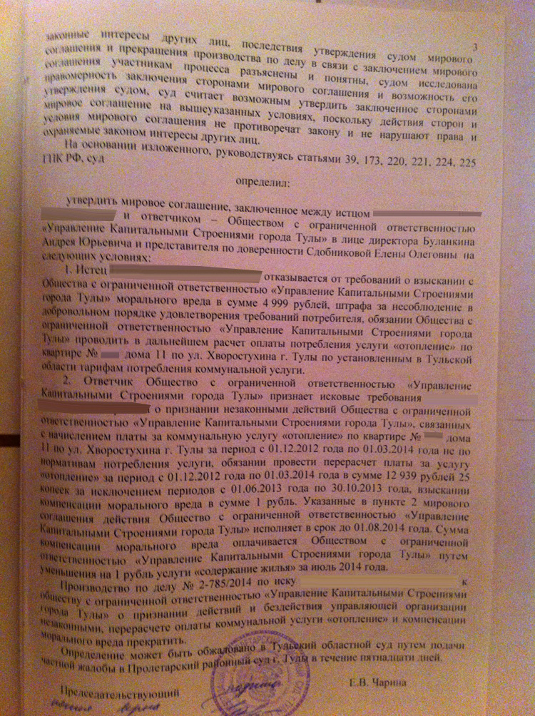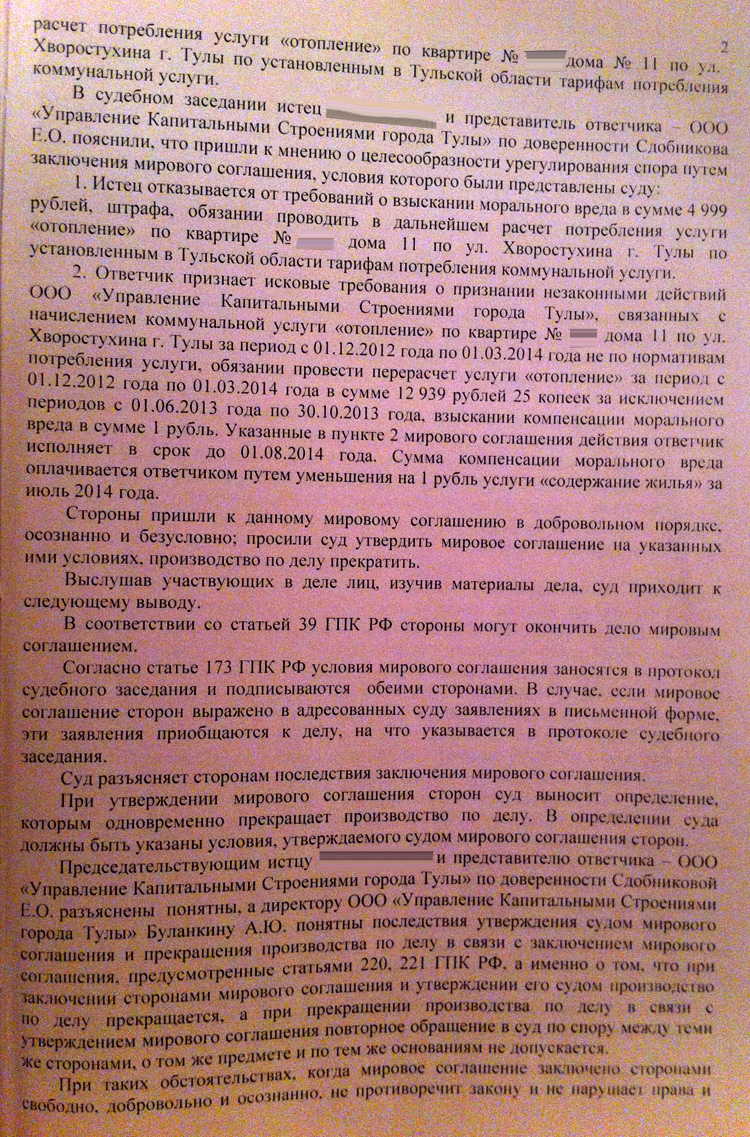 К счастью, у меня есть друг, отличный юрист. Вместе мы решили идти в суд. Собрали все нормативные акты, сделали расчеты и приперли жуликов к стенке. В результате управляющей компании ничего не осталось, как пойти на мировое соглашение (документы прилагаются).
